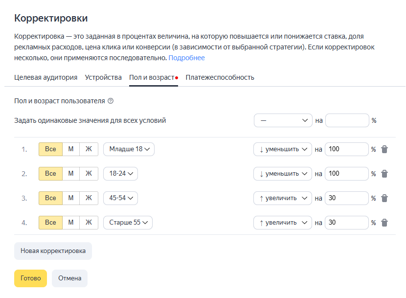 Результат корректировки: целесообразное распределение бюджета для показов нужной аудитории по возрастному признаку. Экономия бюджета.