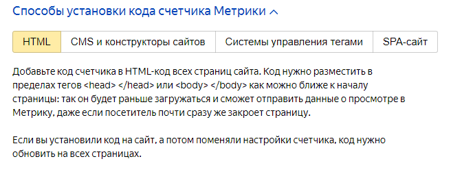 Добавьте код счетчика в HTML-код всех страниц сайта. Код нужно разместить в пределах тегов <head> </head> или <body> </body> как можно ближе к началу страницы: так он будет раньше загружаться и сможет отправить данные о просмотре в Метрику, даже если посетитель почти сразу же закроет страницу.